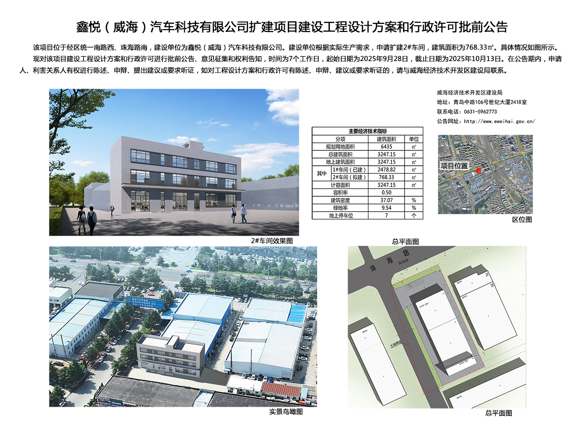 鑫悅(威海)汽車科技有限公司擴建項目建設工程設計方案和行政許可批前公告